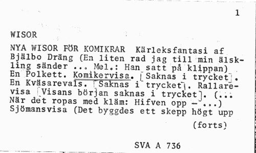 //// 1 //// WISOR //// NYA WISOR FÖR KOMIKRAR Kärleksfantasi af Bjälbo Dräng (En liten rad jag till min älskling sänder Mel.: Han satt på klippan) En Polkett. Komikervisji. f Saknas i trycket":. En Kväsarevals. [Saknas i"trycket^. Rallarevisa j Visans början saknas i trycket (... När det ropas med kläm: Hifven opp -"...) Sjömansvisa (Det byggdes ett skepp högt upp //// (forts) //// SVA A 736 ////