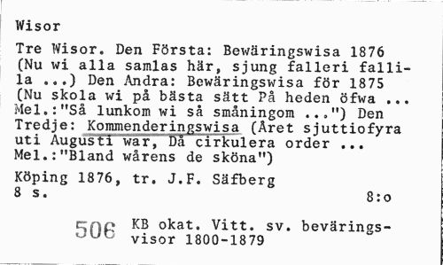 //// Wisor //// Tre Wisor. Den Första: Bewäringswisa 1876 (Nu wi alla samlas här, sjung falleri fallila ...) Den Andra: Bewäringswisa för 1875 (Nu skola wi på bästa sätt På heden öfwa ... Mel.:"Så lunkom wi så småningom ..,") Den Tredje: Kommenderingswisa (Året sjuttiofyra uti Augusti war, Då cirkulera order ... Mel.:"Bland wårens de sköna") //// Köping 1876, tr. J.F. Säfberg 8 s. 8:o //// cjnp KB okat. Vitt. sv. bevärings- //// oUO visor 1800-1879 ////