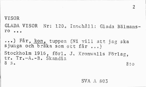//// 2 //// VISOR //// GLADA VISOR Nr; 120a Innehåll: Glada Bälmans-ro //// „..) Får, kon, tuppen (Ni vill att jag ska sjunga och bräka som ett får .»,) //// Stockholm 1916, förl. J0 Kronvalls Förlag, tr, Tr.-Ao-B. Skandia //// 8 3, 8:o //// SVA A 803 ////