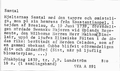 //// Samtal //// Hjeltarnas Samtal med den tappre och omisteli-ga, men på sin hemresa från konstantinopel, i nejden af Breslau, d. 19 Juni 1739, förrädeli-gen mördade Swensk'© Majoren wid Uplands Regemente, den Wälborne Herren Herr Malkom[l]Sinc-lair, uppå de ljufwa Eliseiske Fälten i de dödas rike: herättadt af Herden Celadon, som af en gammal obekant Gubbe blifwit oförmodeligen dit= och dädanförd (Sist, när på ljuflig blomsterplan, ,..) //// Jönköping 1839, tr. J.P, Lundström 8:o //// 16 s. (i samlingsb.and) SVA A ggi ////
