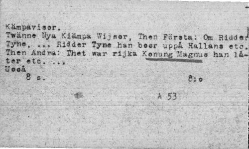 //// Kämpavisor. //// Twänne IJya Kiämpa Wijsor, Then Första: Om Ridde? Tyne, ... Ridd«r Ty ne han boer uppå Hallan» etc, Then Andra: Thet war rijka Konung Magnus han la-% ^ t* Ö • Uooå //// 8 s. B: o //// A 53 ////