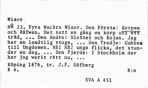 //// Wisor //// 22. Fyra Wackra Wisor. Den Första: Korpen och Räfwen. Det satt en gång en korp uTT élT träd, ... Den Andra: Slottet och Kojan. Jag har en landtlig stuga, ... Den Tredje: Gubben till Ungdomen. Nå i Nå.' unga flicka, det stundar en dag, ... Den Fjerde: I Stockholm der har jag warit rätt nu, ... //// Köping 1876, tr. J.F. Säfberg //// 8 s. 8:o //// SVA A 4 51 ////
