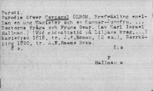 //// Parodi, //// Parodie cfw«r C or c or ÖLBOM. Er^fvräxl ing emellan en ung ilagfeTeroch en Kamar-J u^°;fru, ... "Doctrtrns Fraga och Fruns Swar. (av r^arl Israel Hal Ina r..) [Vid. rr idn&ttstid på. Liljan» kreg, . -. ) Mariefred 1818, tr. J.J,Edman, (2 ex,}, Korrko-pirg 1820, tr, A.Jf.Raams Enka. B b. //// F //// Hallman a ////