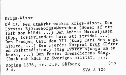 //// Krigs-Wisor //// N- 23. Fem utmärkt wackra Krigs-Wisor. Den Första: Björneborgs=Marschen (Söner af ett folk som blödt ...) Den Andra: Marseljäsen (Upp, fosterlandets barn att strida! ...) Den Tredje: Carl den XII (Kung Carl den unga ! hjelte, ...) Den Fjerde: Korpral Krut (Efter en Folktradition.) (Mig lyster sjunga om en knekt, ...) Den Femte: Grenadierens Sång. (Rask och käck är Sweriges militär, ...) //// Köping 1876, tr. J.F. Såfberg 8:0 //// 8 s« SVA A 126 ////