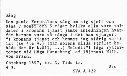 //// Sång //// Den gamle Korpralens sång om sig sjelf och sina 7 söner och 5 mågar hvilka alla voro soldater i kronans tjänst jämte anledningen hvar-för barnen voro så många i det han sjunger: "I kronans tjänst och hemmet jag aldrig varit lat (se 4:e v.) (När solens milda strålar bebåda det är kväll, ...) Melodi:"I låga ryttar-torpet vid Höga Hunneberg" af löjtnant Wilh. von Braun. //// Göteborg 1897, tr. Ny Tids tr. 4 s. 8: o //// SVA A 42 2 ////