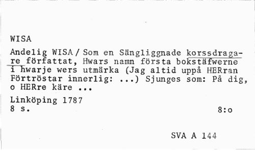 //// WISA //// Andelig WISA/ Som en Sängliggnade korssdraga-re författat, Hwars namn första bokstäfwerne i hwarje wers utmärka (Jag al tid uppå HERran Förtröstar innerlig: ...) Sjunges som: På dig, o HERre käre ... //// Linköping 178 7 //// 8 s. 8:0 //// SVA A 144 ////