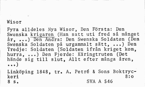 //// Wisor //// Fyra alldeles Nya Wisor, Den Första: Den Swenska krigaren (Han satt uti fred så månget år, ...) öen Andra: Den Swenska Soldaten (Den Swenska Soldaten på urgammalt sätt, ...) Den Tredje: Soldaten (Soldaten ifrån kriget kom, hurra, Den Fjerde: Käringtruten (Det //// hände sig till slut, Allt efter många åren, //// Linköping 1848, tr. A. Petré & Sons Boktryckeri 8:0 8 s. SVA A 546 ////