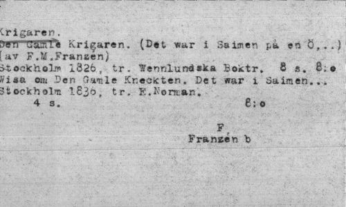 //// .rigarer. //// )Sfl LÄÄffc Krigaren, (Det war i Saimen på en ö,. .) av F.M,Fransen) //// >4»ckh©3if 1326, tr. Wennlund ska Boktr. 8 8. 8,0 ?isa om Den Gamle Knecicten. Det ffar i Saimen... Jtockholii 1836, tr. E.Kornan. //// 4 s. 6:o //// Fr.nL,, „ ////
