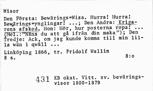 //// Wisor //// Den Första: Bewärings^Wisa. Hurra! Hurra! Bew^är in gs »ynglingar I ...; Den Andra: Krigarens afsked. Hon: Hör, hur posterna ropa! ... meKT^ns" du att gå ifrån din maka."); Den Tredje: Ack, om jag kunde komma till min lilla wän i qwäll ... //// Linköping 1866, tr. Fridolf Wallin 8 s. 8:0 //// 1Q1 KB okat. Vitt. sv. bevärings-visor 1800-1879 ////