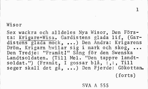//// 1 //// Wisor //// Sex wackra och alldeles Nya Wisor, Den Första: Krigare=Wisa. Gardistens glada lif, (Gar-distens glada mock, ...) Den Ändra: Krigarens Dröm. Krigarn hwilar sig i mark och skog, ... Den Tredje: "Framåt 1" Sång för den Swenska Landtsoldaten. (Till Mel. "Den tappre landt-soldat.") (Framåt, I gossar blå, :,:, Till seger skall det ga, ...) Den Fjerde: Gökottan» //// (forts) //// SVA A 555 ////