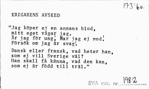 //// nviou. //// KRIGARENS AVSKED //// "Jag köper ej en annans blod, mitt eget vågar jag. Är jag för ung i Har jag ej mod. Försök om jag är svag'. //// Dansk eller fransk, vad heter han, som ej vill Sverige väl? Han skall få känna, vad den kan, som ej är född till träl." //// SVA ccc. nr. ... ////