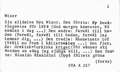 //// 1 //// Wisor //// Sju alldeles Nya Wisor. Den första: Ny Bewä-ringswisa för 189 8 (God morgon kamrater, Wi samlas i dag ...) Den andra: Farwäl till heden (Farwäl, farwäl till heden, farwäl jag lemnar dig, ..») Den tredje: Rhenwinets lof (Ställ nu fram i källarswalen ...) Den fjer. de: Grekisk=Turkiska kriget(För wänner uti Norden en sång jag sjunga will, ...) Den fem^ ter Rinaldo Rinaldini (Uppå fältets gröna //// (forts) //// SVA A 25 7 ////