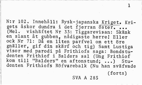 //// 1 //// N:r 102. Innehåll: Rysk-japanska Kriget. Krigets åskor dundra i det fjerran öster. ... (Mel. vishäftet Nr 33: Tiggarevisan: Skänk en slant åt gubben, nådigaste herre! Eller ock Nr 71: Då en liten parfvel om ett öre gnäller, gif din skärf och tig) Samt Lustiga visor med parodi på Frithiofs saga: Bondstu-dent-en Frithiof i Balders sal (Ung Frithiof kom till "Balders" en aftonstund; ...) Studenten Frithiofs Röfvarebalk (Nu han sväfvade //// (forts) //// SVA A 285 ////
