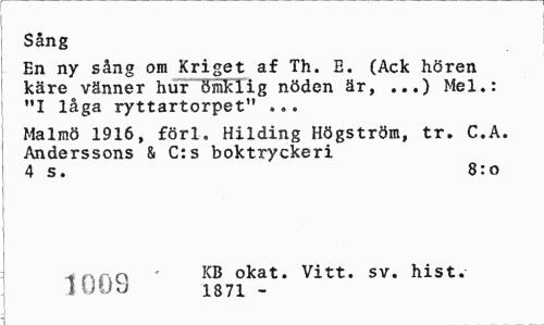 //// Sång //// En ny sång om Kriget af Th. E. (Ack hören käre vänner hulTTJSKIig nöden är, ...) Mel.: "I låga ryttartorpet" ... //// Malmö 1916, förl. Hilding Högström, tr, C.A. Anderssons & C:s boktryckeri 4 s. 8:0 //// 4ftf.n - KB okat. Vitt. sv. hist. lUU b 1871 - ////
