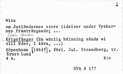 //// Wisa //// om Jutländarnes store lidelser under Tyskarnes framträngande; ... //// .J/Wtt ofalMSJea. C Krigsfångar (En vänlig hälsning sända wi till Eder, I kära, ..,) //// Köpenhamn [1864?), förl. Jul. Strandberg, tr. Ernst Lund //// 4 s. 8:0 //// SVA A 177 ////