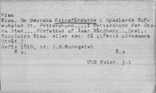 //// Visa //// Wisa, Qn Swenska K r i r? s f år ^a r ne i Hy a öl an da Huf-wudatari 3.t. 11 wrab ur^,,." I *Pe tte réburg der Stora Stad..,.Författad af Isaa Wår gberg.., (mel.; Sinclair* Wisa. eller san; På lifweta mödöaamma Stråt.) //// Gefle l8lO, tr. C.G.Suncäqwlat //// B g. S.o //// UUB Folie V. 3 a ////