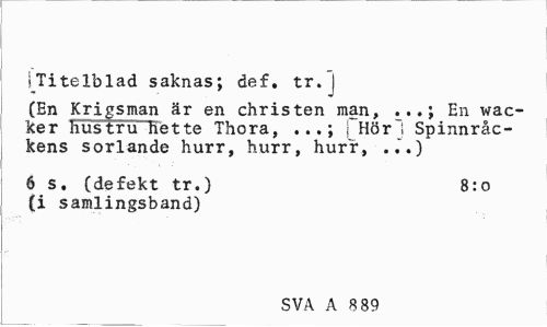 //// sTitelblad saknas; def. tr. | //// (En Krigsman är en Christen man, ...; En wac-ker hustru hette Thora, ..,; | Hör~S Spinnråc-kens sorlande hurr, hurr, hurr, ..".) //// 6 s. (defekt tr.) 8:0 //// (i samlingsband) //// SVA A 8 89 ////