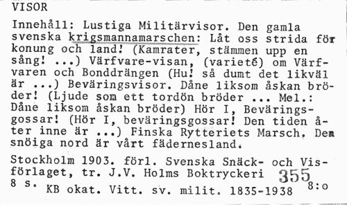 //// VISOR //// Innehåll: Lustiga Militärvisor. Den gamla svenska krigsmannamarschen: Låt oss strida för konung och land.' (Kamrater, stämmen upp en sång! ...) Värfvare-visan, (varieté) om Värf-varen och Bonddrängen (HuJ så dumt det likväl är ...) Beväringsvisor. Dåne liksom åskan bröder! (Ljude som ett tordön bröder ... Mel.: Dåne liksom åskan bröder) Hör I, Bevärings-gossar! (Hör I, beväringsgossar! Den tiden å-ter inne är ...) Finska Rytteriets Marsch, Dea snöiga nord är vårt fädernesland. //// Stockholm 1903. förl. Svenska Snäck- och Visförlaget, tr. J.V. Holms Boktryckeri 355 //// 8 S* KB okat. Vitt. sv. milit. 1835-1938 8:0 ////