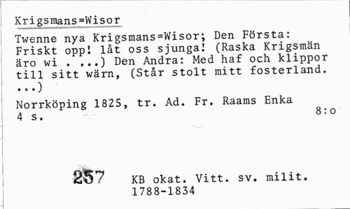 //// Krigsmans=Wisor //// Twenne nya Krigsmans=Wisor; Den Första: Friskt oppl låt oss sjunga! (Raska Krigsmän äro wi . ,..) Den Andra: Med haf och klippor till sitt wärn, (Står stolt mitt fosterland. //// • « • J //// Norrköping 1825, tr. Ad. Fr. Raams Enka 4 s. 8:0 //// ] //// 287 //// KB okat. Vitt. sv. milit. 1788-1834 ////