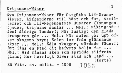 //// 1 //// Kri gsmaris =Wisor //// Nya Krigsmans=Wisor för Östgötha Lif=Grena-iierer, Lifgarderne till häst och fot, Artilleriet och Lif=Regementets Husarer (Konungen bjuder, krigarne samlas ... Mel.: Wikingasä-teni åldriga lundarl\ När lustigt den glada trumpeten går ... Mel.: När solen går upp öf-vqt skogens bryn; Solen ler från glänsande skyar ... Mel.: Ädla skuggor, wördade fäderI; Det fins en stad dit hafwets bölja far ... Mel.: Wid månans sken som spridde silfrets glans; Hur herrligt öfwer stad och land ... //// (forts) //// KB Vitt. sv. milit. - 1900 lQr'' ////