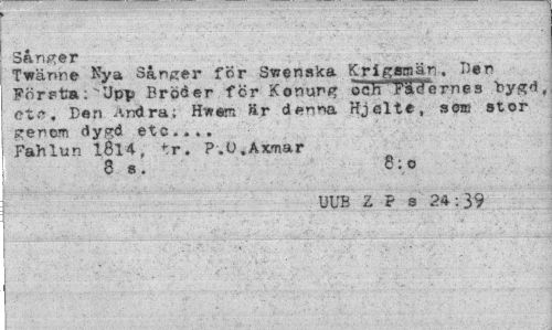 //// » //// Sånger //// Twänne Nya Sånger för Swenska Krigsmän. Der Första: ""Upp Bröder för Konung och Fädernes "byg<i et.~. Ben Andra; Hwetn är dpnna Hjelte, som stor I genom dyptf etc... i Fahlun 1814, tr. P.O.Axmar i 8 s. 8:0 //// j UUB Z ? s 24:39 //// I •¦ -' ••*',<. ¦ Vr • //// ¦ ¦ ////