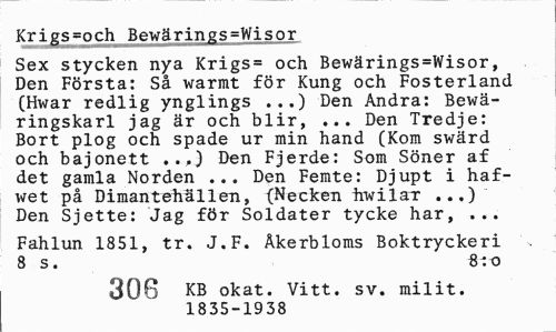 //// Krigs*=och Bewärinjjs=Wisor //// Sex stycken nya Krigs= och Bewärings=Wisor, Den Första: Så warmt för Kung och Fosterland (Hwar redlig ynglings ...) Den Andra: Bewä-ringskarl jag är och blir, ... Den Tredje: Bort plog och spade ur min hand (Kom swärd och b ajonett Den Fjerde: Som Söner af //// det gamla Norden ... Den Femte: Djupt i haf-wet på Dimantehällen, (Necken hwilar ...) Den Sjette: Jag för Soldater tycke har, ... //// Fahlun 1851, tr. J.F. Åkerbloms Boktryckeri 8 s. 8:0 //// 306 KB okat. Vitt. sv. milit. //// 1835-1938 ////