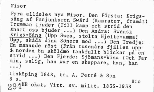 //// Wisor 1 //// Fyra alldeles nya Wisor. Den Första: Krigssång af Fanjunkaren Swärd (Kamrater, framåt! Trumman ljuder (Till kamp och strid den snart oss bjuder ...) Den Andra: Swensk Krigs=Sång (Upp Swea, stolta Hjelte=amma! Upp, skåda dina Söners mod ...) Den Tredje: En manande röst (Från tusenåra fjällen upp i norden En sköldmö tankfullt blickar på en strid ...) Den Fjerde: Sjömans=Wisa (Och Far min, salig, han war en skeppare, han, han •».) //// Linköping 1848, tr. A. Petré & Son 8 s. 8:0 //// 9 q A KB okat. Vitt. sv, milit. 1835-1938 ////