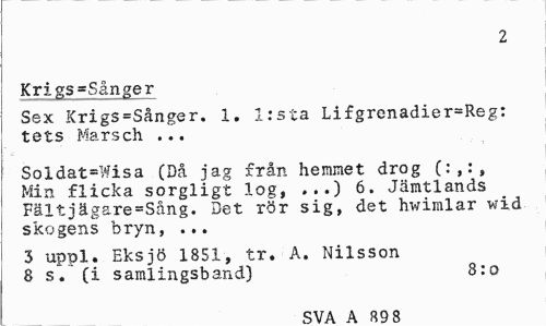 //// 2 //// Krigs =Sjtnger //// Sex Krigs=Sånger. 1. lista Lifgrenadier=Reg: tets Marsch ... //// Soldat=Wisa (Då jag från hemmet drog (:,:, Min flicka sorgligt log, ...) 6. Jämtlands Fältjägare=Sång. Det rör sig, det hwimlar wid skogens bryn, ... //// 3 uppl. Eksjö 1851, tr. A. Nilsson 8 s. (i samlingsband) 8:o //// C V A A Q Q Q ////