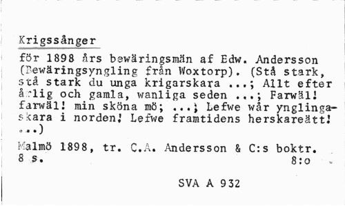 //// Krigs=Sånger //// för 189 8 års bswäringsmiin af Edw. Andersson (Bewäringsyngling från Woxtorp). (Stå stark, stå stark du unga krigarskara Allt efter //// årlig och gamla, wanliga seden .,.; Farwäll farwäll min sköna mö; Lefwe wår ynglinga- //// skara i norden,' Lefwe framtidens herskareättJ ® .« t ) //// Malmö 1898 , tr. C.A. Andersson & C:s boktr. 8 s. 8:o //// SVA A 9 32 ////