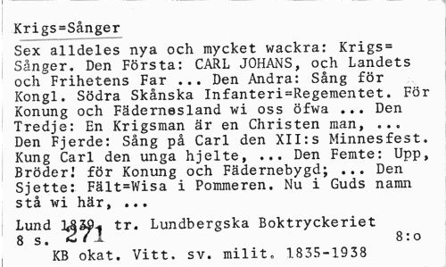 //// Krigs=Sånger //// Sex alldeles nya och mycket wackra: Krigs= Sånger. Den Första: CARL JOHANS, och Landets och Frihetens Far ... Den Andra: Sång för Kongl. Södra Skånska Infanteriregementet. För Konung och Fädernesland wi oss öfwa ... Den Tredje: En Krigsman är en Christen man, ... Den Fjerde: Sång på Carl den XII:s Minnesfest. Kung Carl den unga hjelte, ... Den Femte: Upp, BröderJ för Konung och Fädernebygd; ... Den Sjette: Fält=Wisa i Pommeren. Nu i Guds namn stå wi här, ... //// Lund iUS^-i tr. Lundbergska Boktryckeriet //// 8 s. ' ^ 8:0 //// KB okat. Vitt. sv. milit. 1835-1938 ////