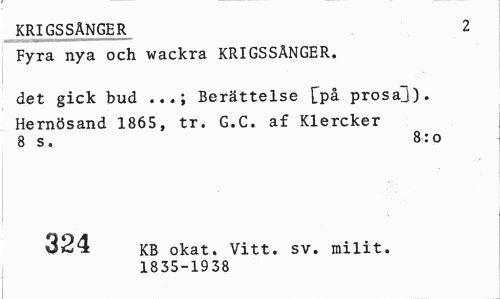 //// KRIGSSÅNGER 2 //// Fyra nya och wackra KRIGSSÅNGER. //// I //// det gick bud Berättelse [på prosaj). //// Hernösand 1865, tr. G.C. af Klercker 8 s. 8: o //// oQf? KB okat. Vitt. sv. ailit. //// 1835-1938 ////