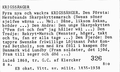 //// KRIGSSÅNGER //// Fyra nya och wackra KRIGSSÅNGER. Den Första: Hernösands Skarpskyttemarsch (Sweas söner sjelfwe wärna ... Mel.: Dåne, liksom åskan, bröder ...) Den Andra: Den unge Skarpskytten ("Fem fot och fem" jag håller wäl ...) Den Tredje: Rekryt=Marsch (Wenster, höger, takt och tu, fan er alla tage ..,) Den Fjerde: Den tappre Swenske friwillige Löjtnant Pehr Konrad Betzholz, som med ära föll i kampen för Danmark wid Lundby (Fram soldater, det ljöd, Fram till seger och död ...) //// Luleå 1868, tr. G.C. af Klercker 326 //// 8 s. 8:o //// KB okat. Vitt. sv. milit. 1835-1938 ////