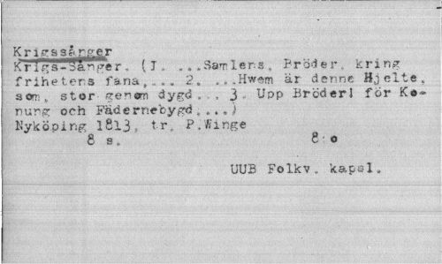 //// Krigssånger //// Krigs-Tanger, (J. .. .Sswnlers, Bröder, kring friheters fana,., . . 2. ,. .Hwem är denne Hjelte, som„ stor• Rrenflrn dygd... 3 Upp Broderi för Konung och Fädernebygd ,. ... ) Nyköping 2813, tr. P.tfinge //// 8 s. fi o //// UUB Folkv» kapsi. ////