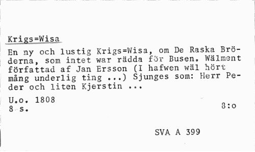 //// Krigs=Wisa //// En ny och lustig Krigs=Wisa, om De Raska Bröderna, som intet war rädda för Busen. Wälment författad af Jan Ersson (I hafwen wäl hört mång underlig ting ...) Sjunges som: Herr Peder och liten Kjerstin ... //// U.o. 1808 //// 8 s. 8:0 //// SVA A 399 ////