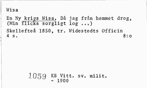 //// Wisa //// En Ny krigs Wisa. Då jag från hemmet drog, (Min flicka sorgligt log ...) //// Skellefteå 1850, tr. Widestedts Officin 4 s. 8:0 //// 1059 KB vitt- sv» milit. //// - 1900 ////