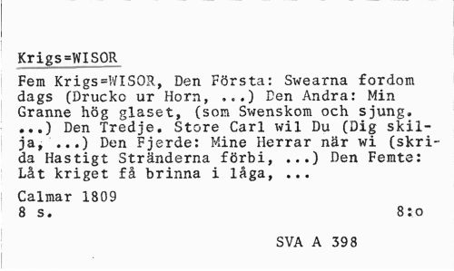//// Krigs=WISOR //// Fem Krigs=WISOR, Den Första: Swearna fordom dags (Drucko ur Horn, ...) Den Andra: Min Granne hög glaset, (som Swenskom och sjung. ...) Den Tredje. Store Carl wil Du (Dig skilja, ...) Den Fjerde: Mine Herrar när wi (skrida Hastigt Stränderna förbi, ...) Den Femte: Låt kriget få brinna i låga, ... //// Calmar 1809 //// 8 s. 850 //// SVA A 398 ////