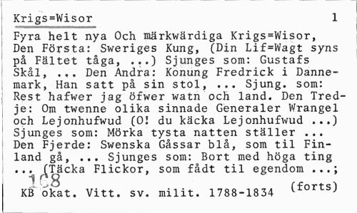 //// Krigs=Wisor 1 //// Fyra helt nya Och märkwärdiga Krigs=Wisor, Den Första: Sweriges Kung, (Din Lif=Wagt syns på Fältet tåga, ...) Sjunges som: Gustafs Skål, ... Den Andra: Konung Fredrick i Danne-mark, Han satt på sin stol, ... Sjung, som: Rest hafwer jag öfwer watn och land. Den Tredje: Om twenne olika sinnade Generaler Wrangel och Lejonhufwud (01 du käcka Lejonhufwud ...) Sjunges som: Mörka tysta natten ställer ... Den Fjerde: Swenska Gåssar blå, som til Finland gå, ... Sjunges som: Bort med höga ting . .^^Täcka Flickor, som fådt til egendom ...; //// KB okat. Vitt. sv. milit. 1788-1834 (£orts) ////