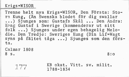 //// Krigs=WISOR //// Trenne helt nya Krigs=WISOR, Den Första: Store Kung, (Än Swenska blodet för dig swallar ,..) Sjunges som: Gustafs Skål ... Den Andra: Kong Gustaf i Swerige (kommenderar ut sitt folk ...) Sjunges under egen behagelig Melo-die. Den Tredje: Sweriges Kung (Din Lif=Wagt syns på fältet tåga ...} Sjunges som den första. //// Calmar 1808 //// 8 s. 8:0 //// -1 >y*y KB okat. Vitt. sv. milit. //// ' < 1788-1834 ////
