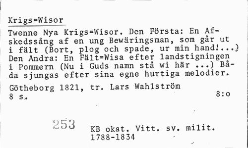//// Krigs=Wisor //// Twenne Nya Krigs=Wisor. Den Första: En Af-skedssång af en ung Bewäringsman, som går ut i fält (Bort, plog och spade, ur min hand.'...) Den Andra: En Fält=Wisa efter landstigningen i Pommern (Nu i Guds namn stå wi här ...) Båda sjungas efter sina egne hurtiga melodier. //// Götheborg 1821, tr. Lars Wahlström 8 5. 8: o //// or-') //// *<tJO KB okat. Vitt. sv. milit. //// 1788-1834 ////