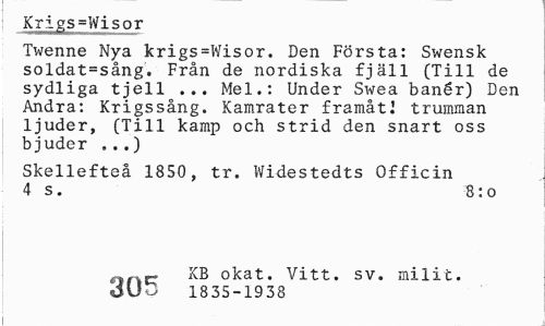 //// Krigs=Wisor //// Twenne Nya krigs=Wisor. Den Första: Swensk soldat=sång. Från de nordiska fjäll (Till de sydliga tjell ... Mel.: Under Swea banér) Den Andra: Krigssång. Kamrater framåt! trumman ljuder, (Till kamp och strid den snart oss bjuder ...) //// Skellefteå 1850, tr. Widestedts Officin 4 s. 8:0 //// finC KB okat. Vitt. sv. milit. //// 1835-1938 ////
