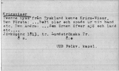 //// xwenne nysr från Tyskland kemne Krigs-Wisor, "Den Första; »».Bci*t plop och spade ur min hand etc. Den Andra. . ..Sem örnen öfwer sjö och la? d etc... //// Jönköping 1813, tr. Lundstrcir.ska Tr. 8 s. 8;o //// UUB Folkv. kapsl. ////