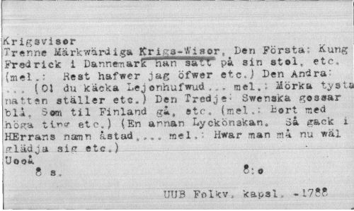 //// Krigsvisor //// Trenne Märkwärdiga Kr i ga-» Wisor, Den Första- Kung Fredrick i Danne-nark nan saft!" pa sin stol, etc, {mel.,: Rest hafwer jag öfwer etcj Den Andra: . , (01 du käcka Lejonhufwud. . mel.: Mörka tys ti natten ställer etc.) Den Tredje^ Swenska gossar b la, Som til Finland ga, etc, (mel.: Bort med höga tlr><r etc.) (En annan Lyckönskan, Sa gäck i HErrar.s namn åstad,... mel," Hwar -nan ma nu wäl r» 1 äd4 a s i g e t c.) Uooa //// 8 s . 8: o //// UUB Folkv, kaps1, -1788 ////
