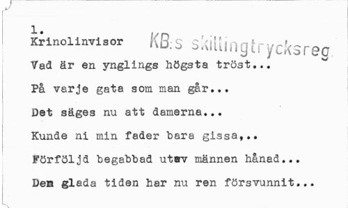 //// M //// Krinolinvisor KB: S 3 killin g t f ycko r 9C Vad är en ynglings högsta tröst... //// På varje gata som man går... //// Det säges nu att damerna... //// Kunde ni min fader bara gissa,.. //// Förföljd begabbad utav männen hånad... //// Den glada tiden har nu ren försvunnit... ////