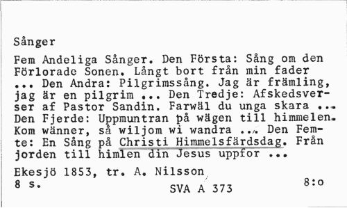 //// Sånger //// Fem Andeliga Sånger. Den Första: Sång om den Förlorade Sonen. Långt bort från min fader ... Den Andra: Pilgrimssång. Jag är främling, jag är en pilgrim ... Den Tredje: Afskedsver-ser af Pastor Sandin. Farwäl du unga skara ... Den Fjerde: Uppmuntran på wägen till himmelen. Kom wänner, så wiljom wi wandra Den Femte: En Sång på Christi Himmelsfärdsdag. Från jorden till himlen din Jesus uppfor ... //// Ekesjö 1853, tr. A. Nilsson //// 8 S* SVA A 373 8:0 ////
