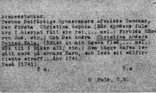 //// « //// ¦ -*' • " . j ' W ¦ - '- - . ' - *•-''¦',"*!;•¦'" • - * ..'V' //// Avekedstankar. //// Twenne Botfärdige Synderskers Afskiede Tanckar, Pen Första Christina Sophia (HÄr syndens ful» arg I hiertat fått sin ret,..,. mel.; Förtida HEi* ren Gud, etc.) Oeh Den Andra Christina Anders. Doj^er (fcRist ut min äg ens tjm^TT* mSF,; • //// H§r til I Riken all, etc.) 3om bägge hafwa be- ' gått mord på annars Barn, sch ledo sit wälför-tiente straff..»åhr 1741. Ueeå (1741) //// 8 s. 8:s //// O Falk, C.S. ////