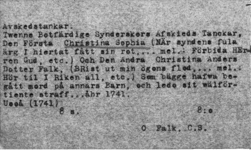 //// ¦' : '. ' •" • • • ¦ ' ¦•¦'• '.: . •• . - -v - ¦• '.-V ' -'A •• ¦ • r. ; •"* //// Avskedstankar. //// Twenne Botfärdige Syndorakora Afakieda Tanckar, Den Första Christina Sophia (NÄr ayndena fula arg X hiertat fått aln' mel.- Förbida HEx* //// ren ( etc.) Och Den Andra Christina Andera Dotter Falk, (BRist ut min ögona flod. mel.; Hör til I Riken all, etc.) 3«bi bägge hafwa begått mord på annara Barn, och ledo ait wälför-tiente straff...åhr 1741.. Ua.å (1741) //// 8 8. 8:a //// 0 Falk. C.3. ////