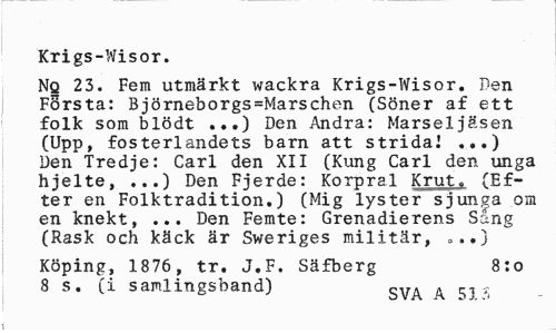 //// Krigs-Wisor. //// Nq 23. Fem utmärkt wackra Krigs-Wisor. Den Första: Björneborgs=Marschen (Söner af ett folk som blödt ...) Den Andra: Marseljäsen (Upp, fosterlandets barn att strida! .,.) Den Tredje: Carl den XII (Kung Carl den unga hjelte, ...) Den Fjerde: Korpral Krut. (Efter en Folktradition.) (Mig lyster sjunga om en knekt, ... Den Femte: Grenadierens Sang (Rask och käck är Sweriges militär, ...) //// Köping, 1876, tr. J.F. Säfberg 8:0 //// 8 s. (i samlingsband) gy^ ^ ////