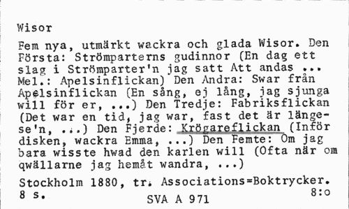 //// Wisor //// Fem nya, utmärkt wackra och glada Wisor. Den Första: Strömparterns gudinnor (En dag ett slag i Strömparter*n jag satt Att andas ... Mel.: Apelsinflickan) Den Andra: Swar från Apelsinflickan (En sång, ej lång, jag sjunga will för er, ...) Den Tredje: Fabriksflickan (Det war en tid, jag war, fast det är längesen, .i.) Den Fierde: Krögaref3,ickan fInför disken, wackra Emma, ...) Den Femte: Om jag bara wisste hwad den karlen will (Ofta när om qwällarne jag hemåt wandra, ...) //// Stockholm 1880, tr* Associations=Boktrycker. //// 8 s* SVA A 971 8:0 ////