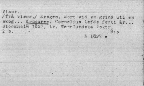 //// Vi sor. //// /Två visor./ Krogen, bort wid en grind uti en skog.. . Kromaren. Cernelius iefde fewti år... atoekhoiwi 1827,'tr, Wennlund ska £o.<t r. //// B:o //// ii. 1827 « ////