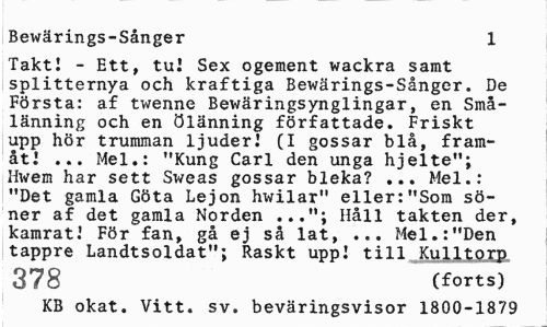 //// Bewärings-Sånger 1 //// Takt! - Ett, tu! Sex ogement wackra samt splitternya och kraftiga Bewärings-Sånger. De Första: af twenne Bewäringsynglingar, en Smålänning och en ölänning författade. Friskt upp hör trumman ljuder! (I gossar blå, framåt! ... Mel.: "Kung Carl den unga hjelte"; Hwem har sett Sweas gossar bleka? ... Mel.: "Det gamla Göta Lejon hwilar" eller:"Som söner af det gamla Norden ..."; Håll takten der, kamrat! För fan, gå ej så lat, ... Mel.:"Den tappre Landtsoldat"; Raskt upp! t i 11 J&LllaöL //// 378 (forts) //// KB okat. Vitt. sv. beväringsvisor 1800-1879 ////